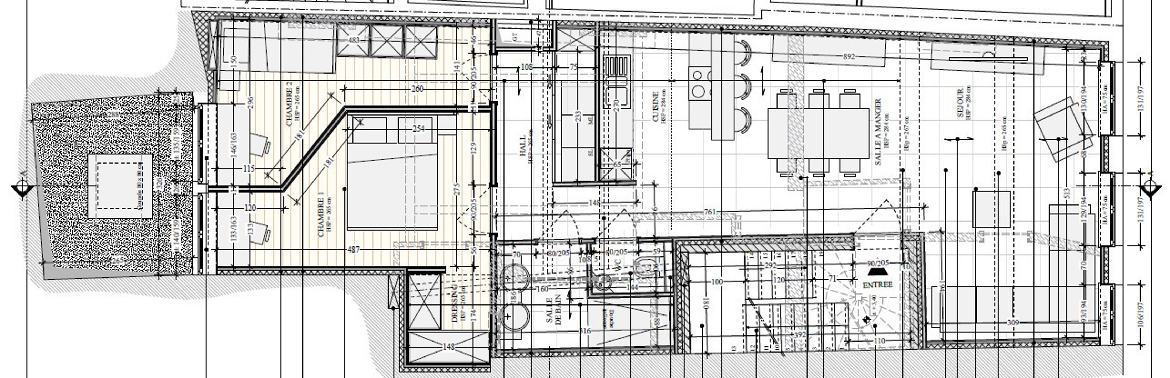 Composition : beau séjour avec cuisine ouverte et entièrement équipée, toilettes séparées avec lave-mains, salle de douche, deux chambres dont une avec coin dressing, hall de nuit avec espace buanderie et cave.