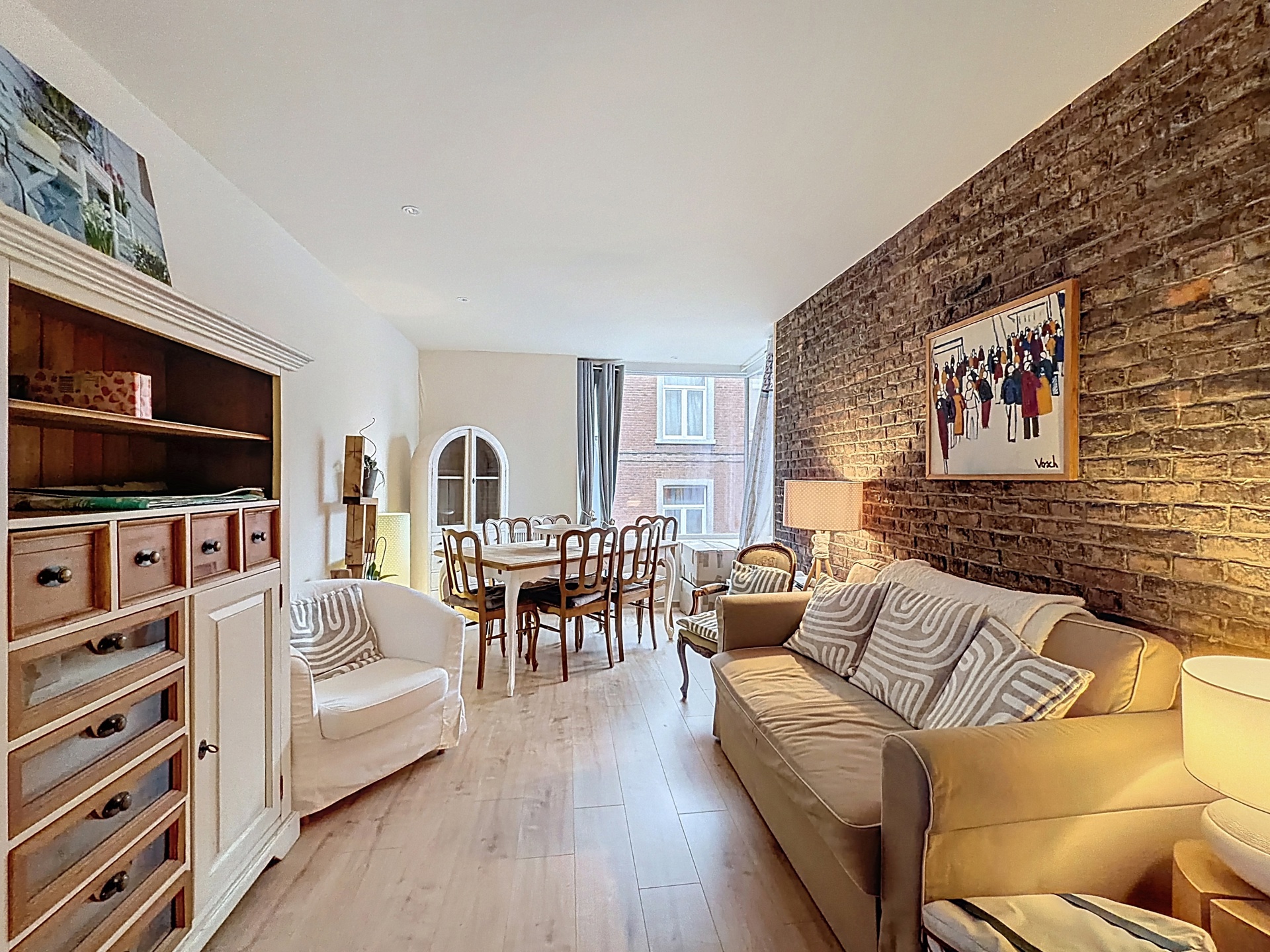 Séjour lumineux avec cuisine ouverte équipée (frigo, four, taque, hotte)